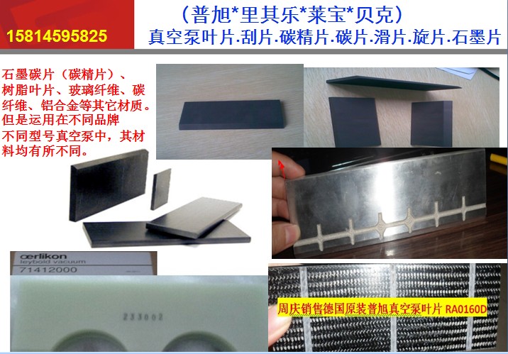 真空泵葉片.刮片.碳精片.碳片.滑片.旋片.石墨片 市面上常見的真空泵葉片材質(zhì)有多種,一般有石墨碳片(碳精片)、樹脂葉片、玻璃纖維、碳纖維、鋁合金等其它材質(zhì)。但是運(yùn)用在不同品牌不同型號(hào)真空泵中,其材料均有所不同。技術(shù)要求 真空泵葉片的材料具有較高抗彎強(qiáng)度,在擾油起動(dòng)時(shí)和較高入口壓力下運(yùn)轉(zhuǎn)時(shí)不易變形、彎折;密度比鐵小,故離心力小,對(duì)缸壁的磨損小,不會(huì)直接與金屬咬合;可承受高溫;其長(zhǎng)度方向的熱膨脹系數(shù)較小,與鑄鐵相當(dāng),故設(shè)計(jì)時(shí)此方向上的公差可按鑄鐵件考慮,厚度方向的膨脹系數(shù)較大,硬度較高,油潤(rùn)滑摩擦因數(shù)較小,在有充分油潤(rùn)滑的前提下耐磨耐用。 進(jìn)口品牌真空泵:德國(guó)BUSCH普旭.德國(guó)LEYBOLD萊寶.德國(guó)BECKER貝克.德國(guó)RIETSCHLE(Gardner Denver)里其樂(lè)。英國(guó)EDWARDS愛德華等進(jìn)口真空泵以及真空泵配件。(葉片.旋片.滑片.碳精片.石墨片.刮片)